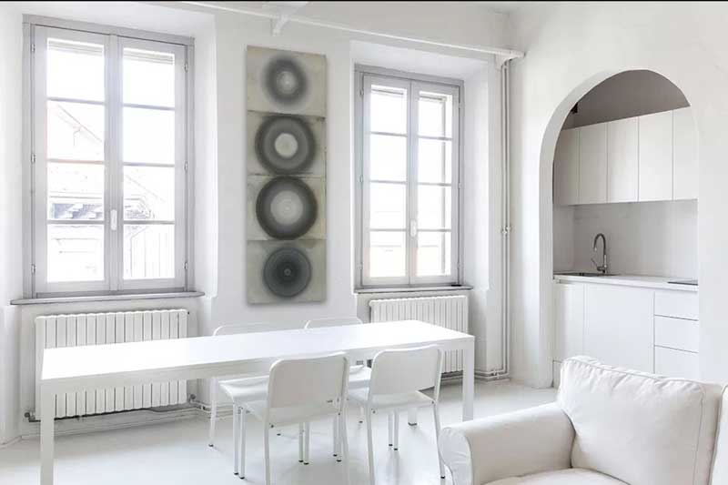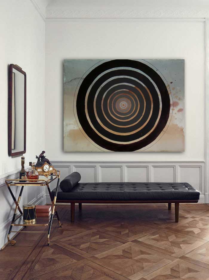 Fast forward to 2017 and David Lynch and I are in the same artistic circles. No, we’re not actually, but without any planning or awareness on my part I’ve been mining a similar vein of minimalist imagery, concentric circles. Here in Los Angeles David shows his work at Kayne Griffin Corcoran so I’ve seen his most recent work and it bears little resemblance to the piece seen in House and Garden.  He’s changed. Meanwhile I’m quite happy to take up the cause. What we need now are more places to stop and contemplate the quiet Zen hum of the Universe. Art must be transcendental. That’s the way I see. What about you?