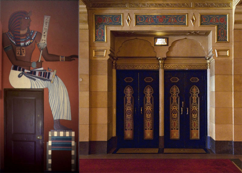 I mentioned in my last post that I wasn't keen on using the human figure in my work. Ironically the first paying gig I got as a muralist I painted a human figure. But it is very stylized, very abstracted figuration. It's taken directly from a surviving Ramses II image from ancient Egypt and I painted it in the Fabulous Fox Theater, of Atlanta. This was 1981 (or '82) and my first exposure to decorative painting. In fact my job at the Fox was rather pedestrian. I was mostly doing house painting for Joe Patton who lived in an apartment in the Fox. Sensing my lack of fulfillment my boss threw me a bone and let me create a mural in a place where one did not exist. He sits over the door to the back entrance to the box office. You would see it if you simply opened a door off the lobby that you're not suppose to -and you have my permission to do so. Tell them you're looking for Ramses in your best Charlton Heston-Moses-voice of authority.