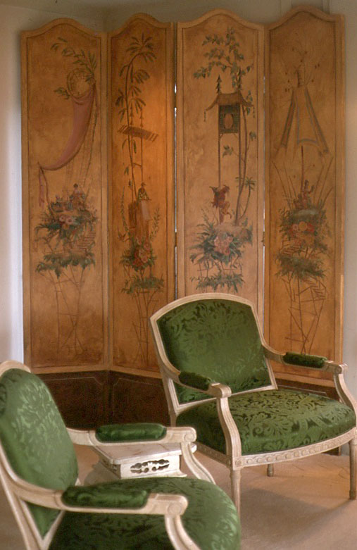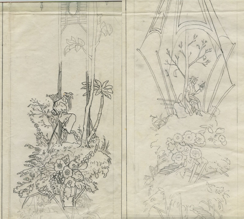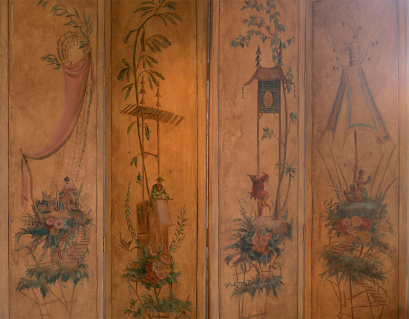 The theater is filled with elaborate decorative painting and it was in the process of being restored by decorative painters but I arrived on the scene a bit late and they didn't really need another decorative painter. Still, it wasn't long after I painted my mural there that I left to work on more interesting projects. And in fact I have used the human figure now and then. I like the use of the figure in chinoiserie because it's given no more importance than a flower or an umbrella. The photos of my screen are sort of terrible so I scanned my original sketches for you: